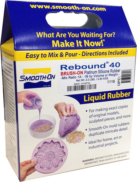 Rebound Self Thickening Brush-On Silicone Rubbers Rebound silicone rubbers are easy-to-use platinum-cure silicone rubbers which self-thicken for making brush-on molds of almost any model. Mixed 1A:1B by volume (no scale necessary), Rebound can be applied with a brush or spatula to vertical surfaces without sagging and will cure with negligible shrinkage to a flexible rubber. 3 to 4 layers are all that is necessary to make a strong, durable production mold for casting wax, gypsum, concrete or resins (urethane, polyester, etc.) And because Rebound is a platinum silicone, it will last for many years in your mold library. Applications include reproducing sculpture, architectural restoration, making candle molds, etc. Rebound 40 - Shore 40A hardness