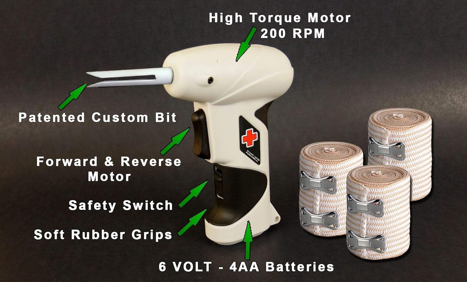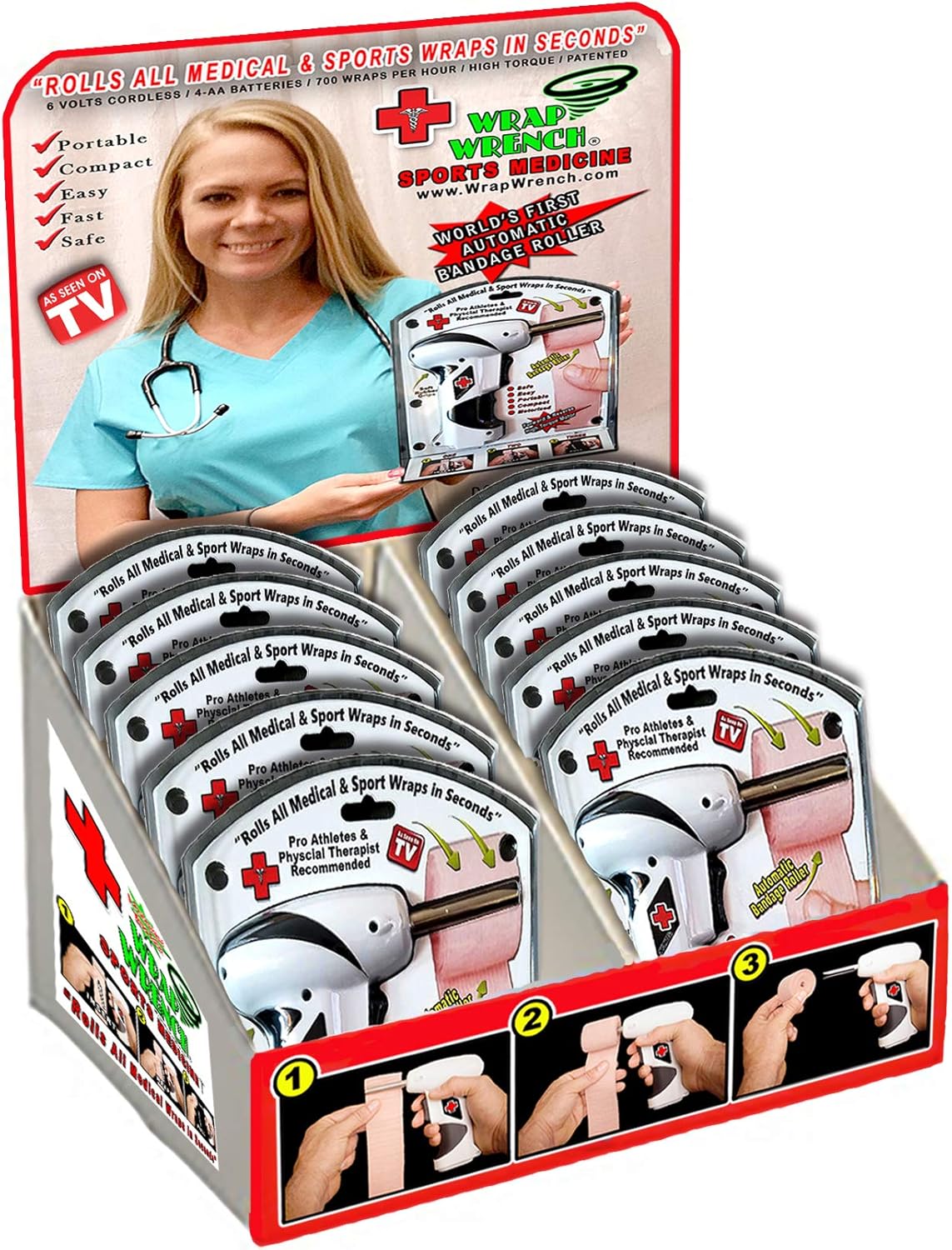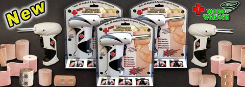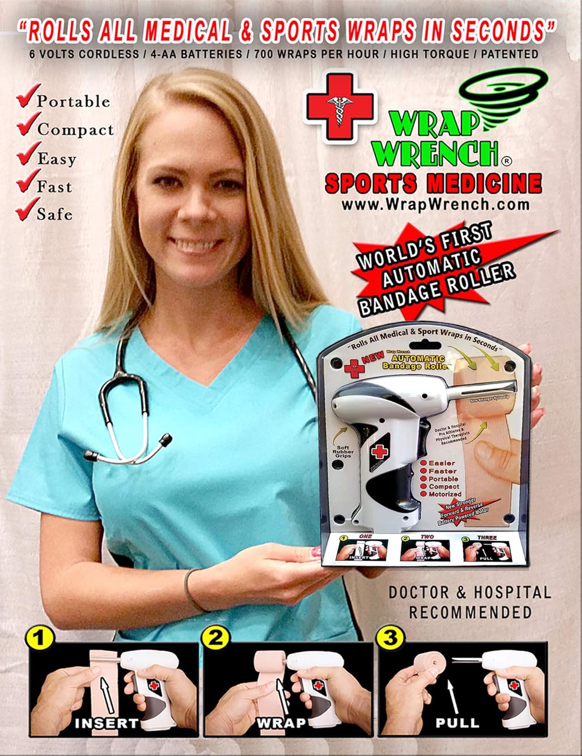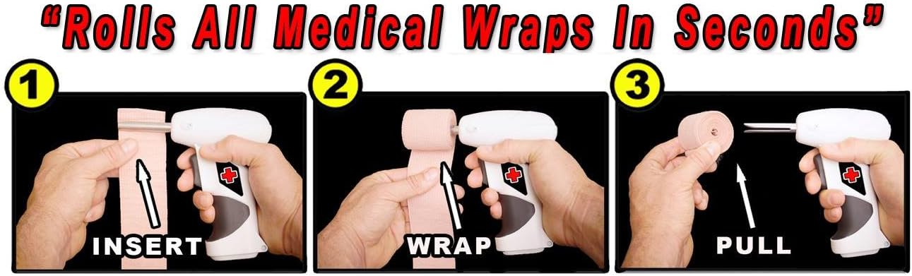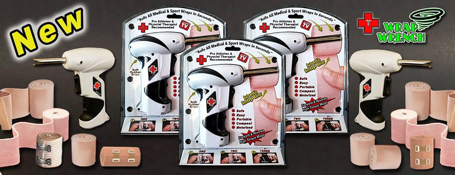 "Rolls Sports & Medical Wraps In Seconds" Our New Patented invention, THE WRAP WRENCH helps to rolls medical and sports wraps in seconds. Used by professional athletes, trainers, doctors, nurses, physical therapists, elderly and everyday people. Our new patented product rolls all wrap like new so they're ready to be stored or reapplied. The Wrap Wrench is compact, portable and battery powered. The New Wrap Wrench is made from the highest quality material to last for years. The high torque motor has a forward and reverse rotation, soft rubber grips and a safety switch.